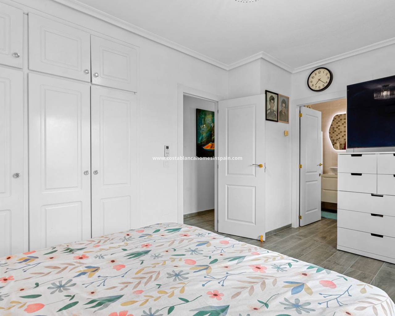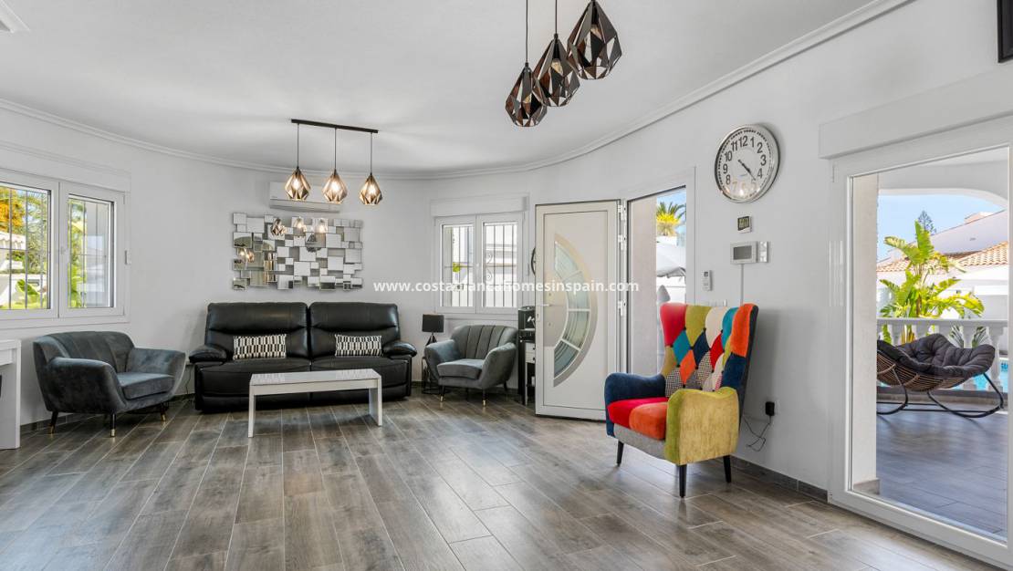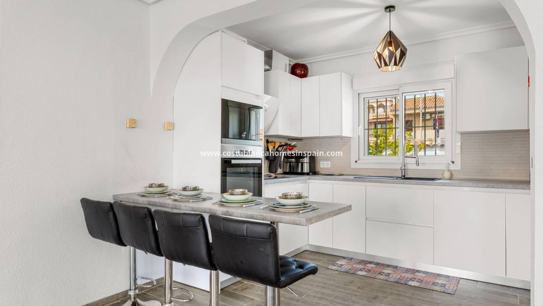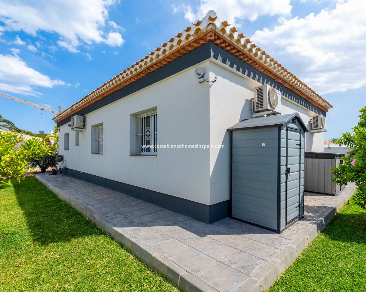 This fantastic property is located in the famous area of Playa Flamenca, just a few minutes walk from the Shopping center Zenia Boulevard and the beach, and Just a short walk to the market street. The property has high private walls with access via the electric gate for your private parking. The sunny large garden has fruit trees and natural grass, palm trees, and Estrilizias, easy to maintain but giving a romantic environment all year round. There is a large private pool (4m x 8m) on the sunny side of the property and a relaxing area with sun beds and chairs. The property's entrance is south, along with its terrace where you can enjoy al fresco evenings and afternoons, and the perfect breakfast place. Passing the front door, you will find yourself in the large lounge with a modern refurbished kitchen fully equipped with high-quality white goods. From the lounge large corridor leads you into the sleeping area, where you have 3 double bedrooms, 1 bathroom, and an ensuite bathroom in the master bedroom at the end. There utility room gives space for the modern boiler and to store every extra you might have for the kitchen and cleaning. The property has underfloor heating everywhere, divided into sections, and air conditioning in every room. The materials used in the building are of very high quality and the house all external walls have been made double thickness for extra insolation. All windows and doors changed for high quality double glased ones with electric blinds. The layout of this property is perfect for a small family to live all year round or for their holidays. The location is perfect, and the orientation invites you to stay in the sun daily.