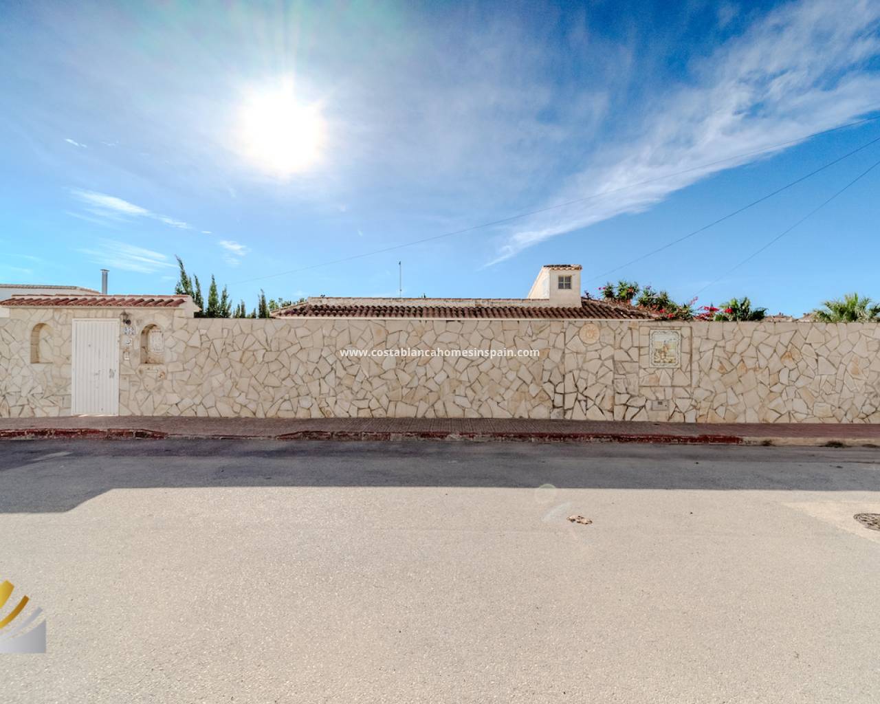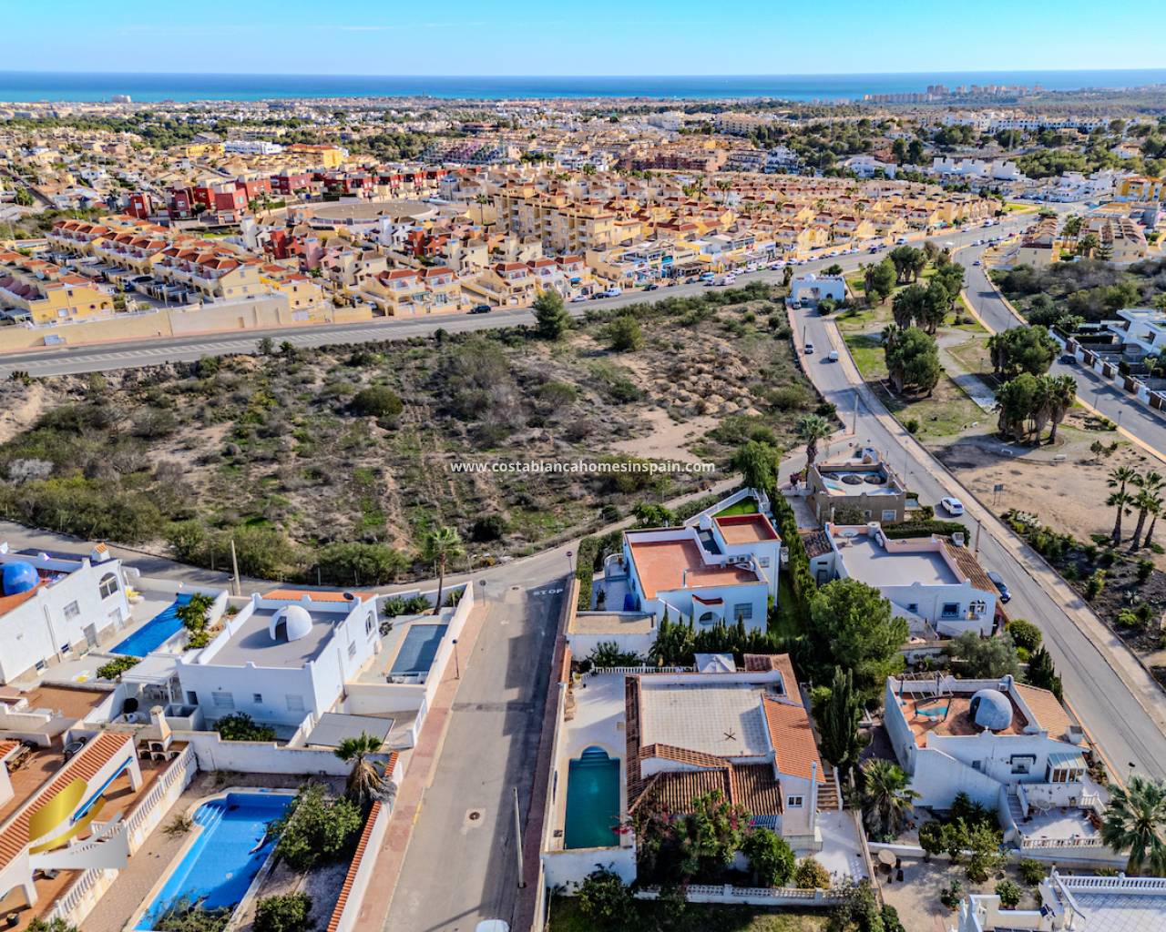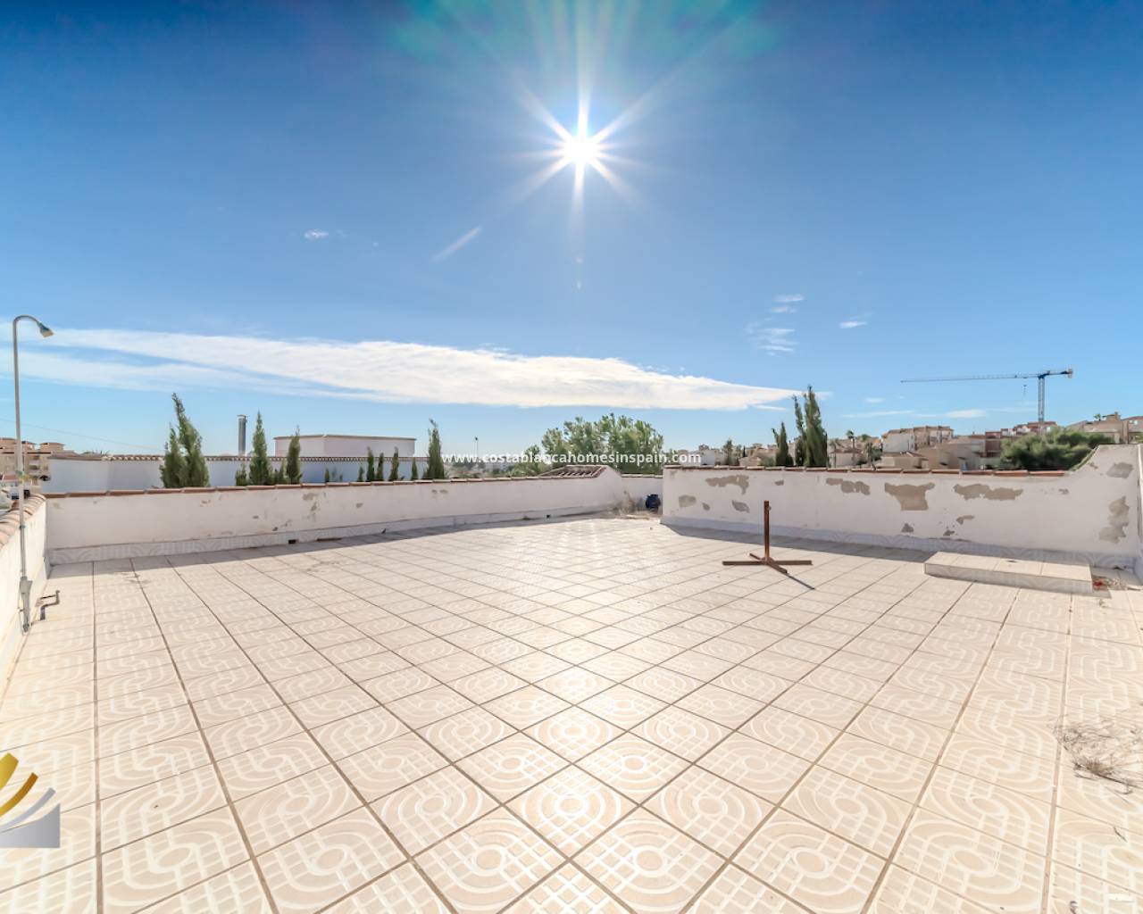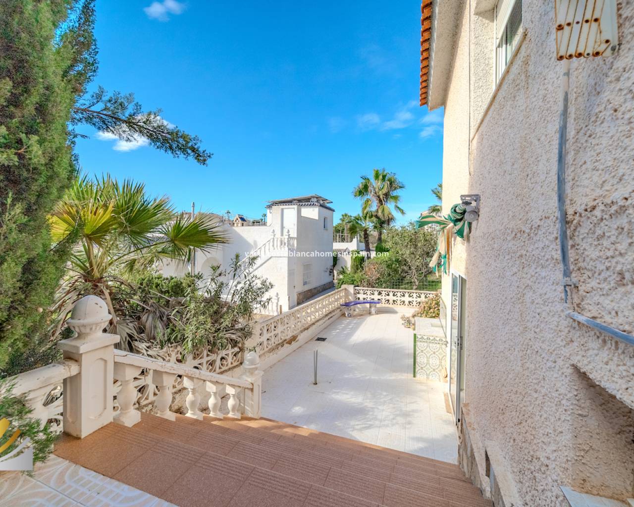 Detached 3 bedroom villa with private pool and separate annex in Blue Lagoon. The property is built on a 493m2 plot and offers a private pool, landscaped gardens, an enclosed terrace, and a roof solarium with fantastic views of the sea towards La Manga and the Torrevieja salt lakes. The main house comprises of an enclosed front terrace leading into the lounge-dining area with an open kitchen, 3 bedrooms and a fully renovated bathroom. There is a separate annex located underneath the main house that has its own private entrance and comprises of an entrance hallway, a separate kitchen. Internal stairs to the side of the property lead to the large roof solarium with stunning views of the sea and Torrevieja salt lakes.