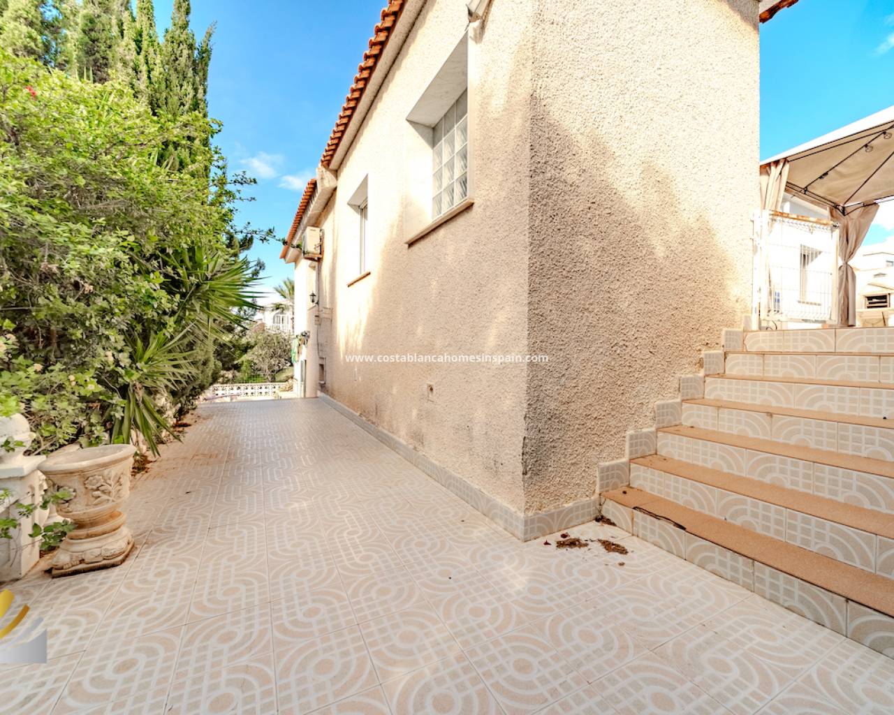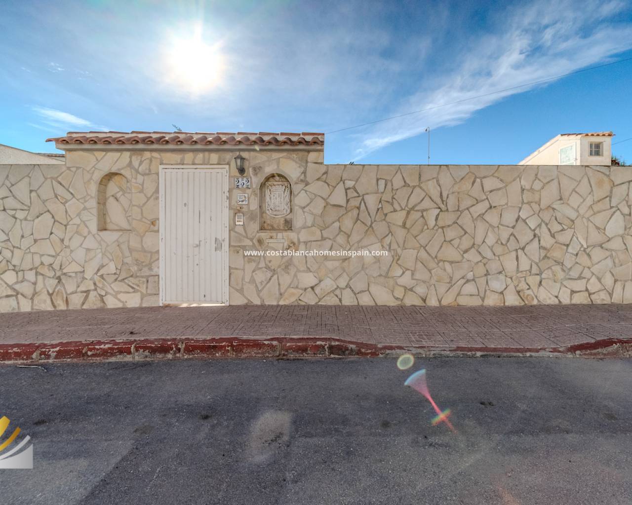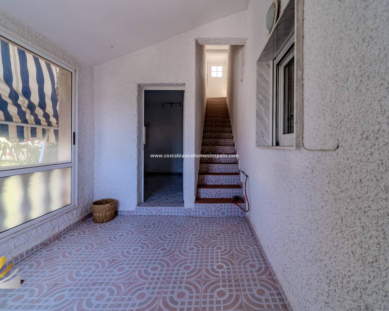Detached 3 bedroom villa with private pool and separate annex in Blue Lagoon. The property is built on a 493m2 plot and offers a private pool, landscaped gardens, an enclosed terrace, and a roof solarium with fantastic views of the sea towards La Manga and the Torrevieja salt lakes. The main house comprises of an enclosed front terrace leading into the lounge-dining area with an open kitchen, 3 bedrooms and a fully renovated bathroom. There is a separate annex located underneath the main house that has its own private entrance and comprises of an entrance hallway, a separate kitchen. Internal stairs to the side of the property lead to the large roof solarium with stunning views of the sea and Torrevieja salt lakes.